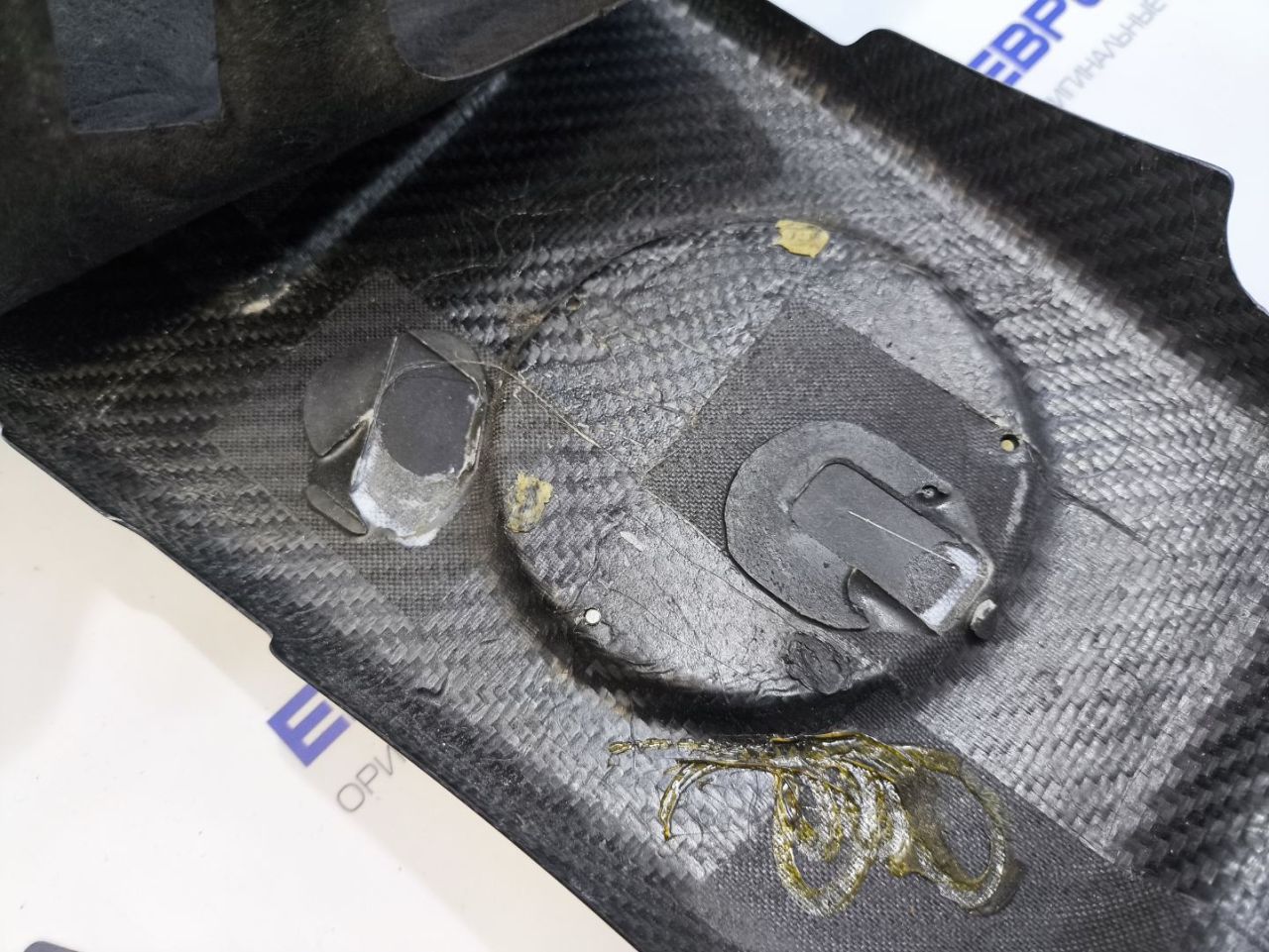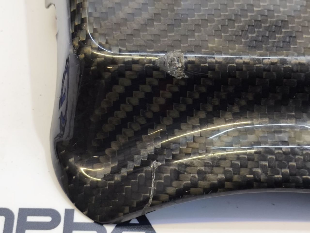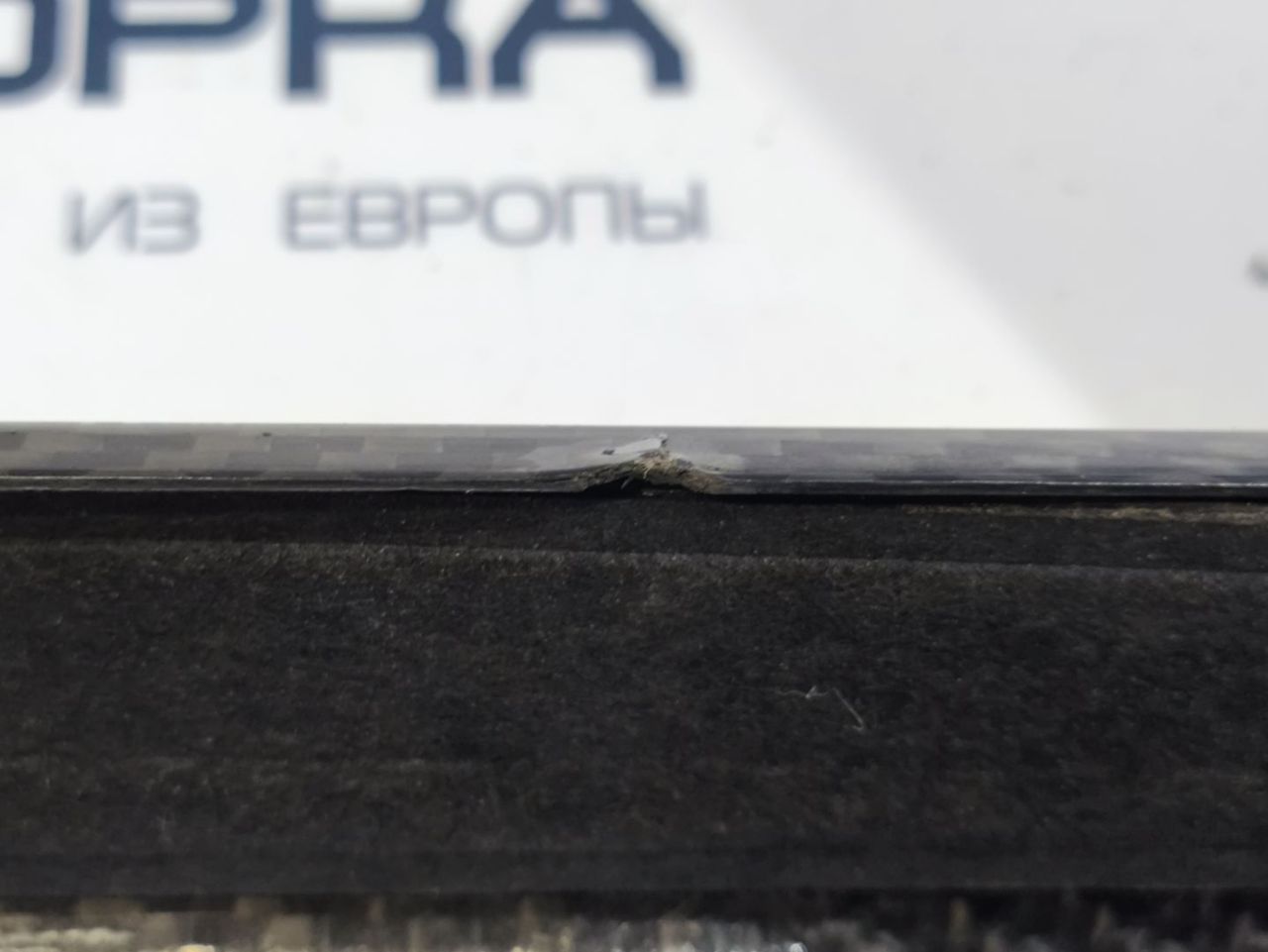 Карбон. Присутствует трещина, потёртости, сколы и царапины. Отломаны крепления в передней части.